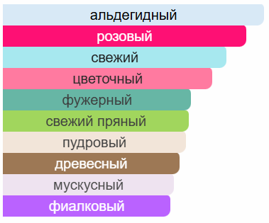 Аромат начинается с ярких и свежих нот розы, альдегидов и герани, которые плавно переходят в сердечные цветочные ноты фиалки и её листьев. Завершается парфюм глубокими и чувственными акцентами амбретты и сандалового дерева, придающими композиции стойкость и утонченность.