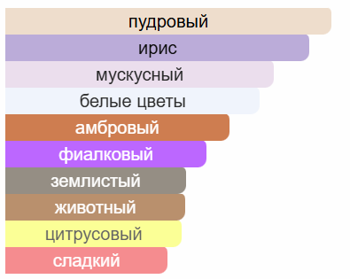 Композиция начинается с утончённого аромата цветка апельсина, придающего свежесть и лёгкость. В сердце раскрывается благородный ирис, добавляя пудровую мягкость и изысканность. Базовые ноты мускуса и амбры создают тёплый, обволакивающий шлейф, подчёркивая глубину и стойкость аромата.