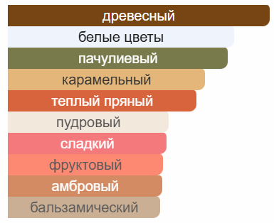 Аромат начинается с сочных и свежих нот персика, сочетающихся с терпким жасмином. В сердце раскрывается сладость карамели, дополненная смолистыми оттенками амбры. Завершается аромат тёплыми и пряными нотами пачули и сандалового дерева, создавая долгий и чувственный шлейф.