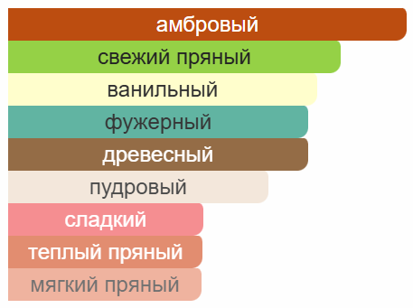 Аромат обладает изысканной пирамидой нот. Он начинается с нежного, едва уловимого звучания цитрусовых, которое тут же окутывает густая дымка из аккордов кориандра, мускатного ореха и герани. Затем композиция плавно переходит в загадочный шлейф, включающий чувственные древесные ноты, сладкую ваниль, роскошные аккорды амбры, элегантные ноты сандалового дерева и нежные аккорды бобов Тонка.