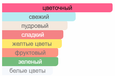 Аромат раскрывается экстравагантным сочетанием цветов мимозы и чёрной смородины, с добавлением розы и миндаля. В сердце композиции вновь раскрываются зелёные ноты мимозы и цветы, приправленные сладким ароматом миндаля и фиалки. Завершается аромат мягким шлейфом ванили, сандалового дерева и бензоина, создавая изысканное и тёплое послевкусие.