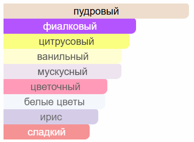 Аромат раскрывается яркими фруктовыми нотами чёрной смородины и мандарина, с мягким привкусом черники и бергамота. В сердце композиции раскрываются чувственные цветочные акценты жасмина, мимозы и розы, а в базе ощущаются тёплые и древесные ноты сандала, амбры и мускуса, дополненные сладкими оттенками сахара и бобов Тонка.