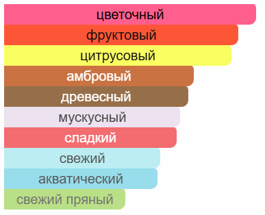 Верхние ноты: груша, горький апельсин, бергамот Сердечные ноты: фрезия, молекула Pomarose, молекула Mahonial™ Базовые ноты: молекула Ambroxan, молекула Iso E Super, молекула Sylkolide™, кедр, древесина омбу