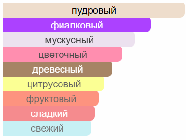 Аромат открывается свежими и сочными аккордами груши, бергамота и мандарина, придающими композиции бодрость и игривость. В сердце раскрывается нежный букет фиалки, цветочных нот и лаванды, добавляя утончённости и романтичности. Базовые ноты мускуса, сандалового дерева, ванили и пачули создают тёплый и обволакивающий шлейф, оставляя после себя стойкое и приятное послевкусие.