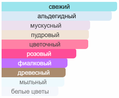 Аромат открывается яркими нотами розового перца и пьянящей розы, усиленными альдегидами. В сердце композиции раскрываются нежные цветочные акценты фиалки, пионов и флёрдоранжа, а завершается парфюм глубоким и чувственным послевкусием сандалового дерева, белого дерева и мускуса.