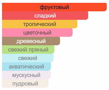 Аромат открывается ярким фруктовым взрывом с нотами папайи, граната и груши, переходя в более мягкие и цветочные акценты с персиком, гибискусом и фрезией. Завершается композиция нежными и тёплыми нотами амбры и мускуса, создавая лёгкий и приятный шлейф.