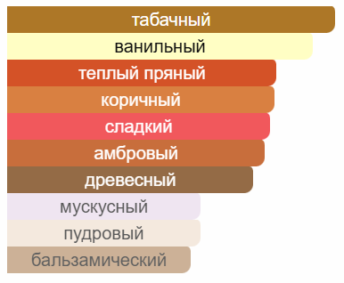 Аромат открывается чувственным дуэтом интригующей корицы и жгучего американского перца, создавая тёплое и пряное первое впечатление. В сердце композиции раскрываются бальзамические оттенки лабданума, дымные аккорды ладана, насыщенные ноты листа табака и загадочный османтус, придающие аромату глубину и сложность. Шлейф окутывает сладостной ванилью, утончённым белым кедром, влажным ветивером и элегантным мускусом, оставляя длительное и запоминающееся послевкусие.