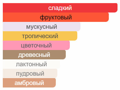 Аромат открывается сочной фруктовой свежестью с нотами питахайи, лесных ягод и ананаса. В сердце композиции раскрываются сладкие и экзотические акценты кокоса, орхидеи и амбретты, придающие аромату теплую и чувственную атмосферу. Завершают композицию тёплые ноты пралине, мускуса и Amberwood, создавая глубокий и стойкий шлейф.