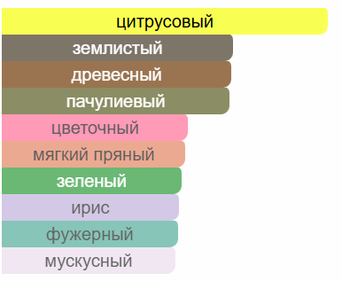 Начало аромата раскрывается с ярких цитрусовых аккордов мандарина и бергамота, добавленных к пряным нотам имбиря и кардамона. В сердце композиции раскрывается цветочный букет из фиалки, лилии, жасмина и алой розы. Базовые ноты мускуса и дубового мха создают долгий шлейф, придавая аромату стойкость и гармонию.